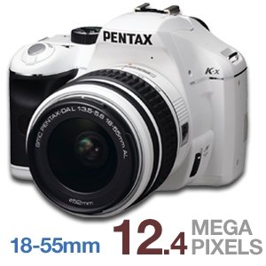 Pentax K-x 12.4 MP Digital SLR with 2.7-inch LCD and 18-55mm f/3.5-5.6 AL Lens (white). The Pentax K-x offers high-end features including Live View, HD video and photographic performance that challenges higher class models. Since there?s no rule that SLR cameras must come in one color, try the K-x in a choice of white or black, as well as special, limited edition red and navy. With a one-handed shPentax K-x 12.4 MP Digital SLR with 2.7-inch LCD and 18-55mm f/3.5-5.6 AL Lens (white). The Pentax K-x offers high-end features including Live View, HD video and photographic performance that challenges higher class models. Since there?s no rule that SLR cameras must come in one color, try the K-x in a choice of white or black, as well as special, limited edition red and navy. With a one-handed sh... Read More